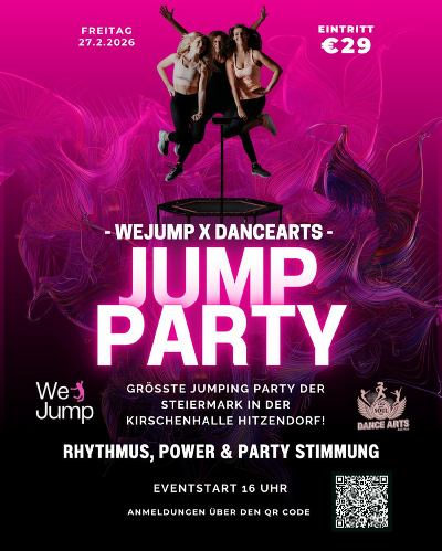 Eintritt: € 29,-Anmeldung: mit QR-Code oder unter https://www.eventbrite.at/e/jump-into-the-night-wejump-x-dancearts-austria-tickets-1975882506767?aff=oddtdtcreatorNähere Infos zum Veranstalter »